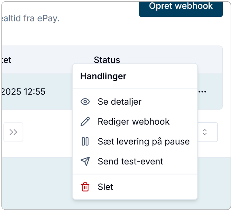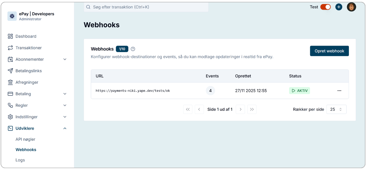 I ePays backoffice finder du webhooks under Udviklere > Webhooks. Her kan du oprette op til 10 webhooks, hver med sin egen URL og et valgfrit sæt events.