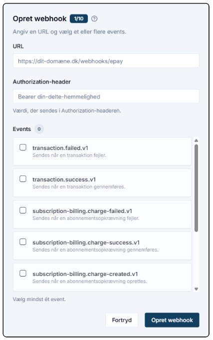 - En Authorization-header: en hemmelig nøgle som sendes med hver webhook. Det er din sikkerhed for at beskederne faktisk kommer fra ePay og ikke fra nogen, der udgiver sig for at være os.